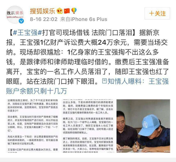 有消息曝出王宝强就连打官司的钱都是借的,在法院门口落泪,工作人员都看不下去了。
