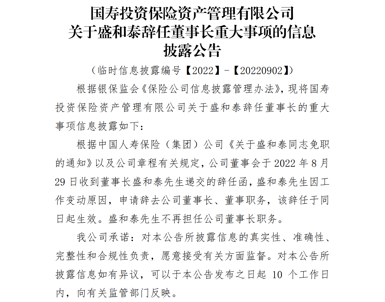 近日,中国人寿旗下专业另类投资平台——国寿投资保险资产管理有限公司(以下简称“国寿投资”)公告,根据中国人寿保险(集团)公司(以下简称“中国人寿集团”)《关于盛和泰同志免职的通知》以及公司章程有关规定,公司董事会于2022年8月29日收到董事长盛和泰先生递交的辞任函,盛和泰先生因工作变动原因,申请辞去公司董事长、董事职务,该辞任于同日起生效。盛和泰先生不再担任公司董事长职务。
