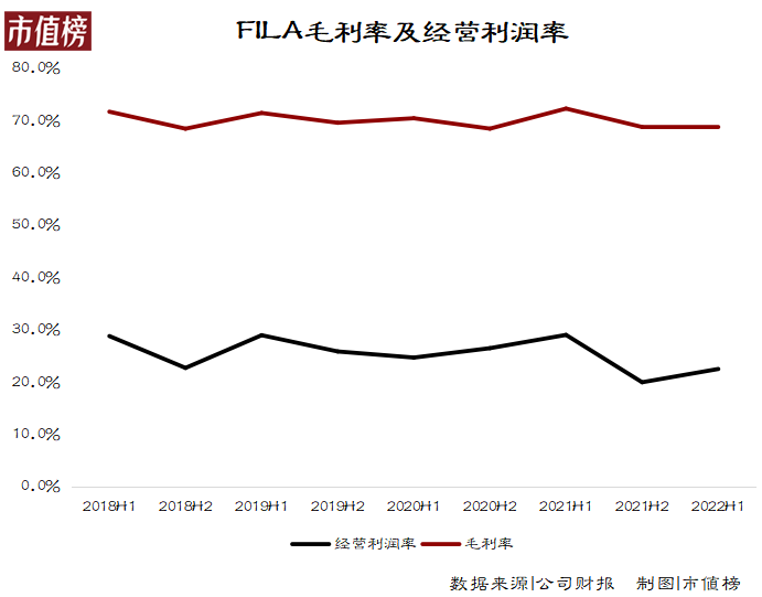 上半年,FILA实现营收107.77亿元,同比首次下滑,经营利润24.26亿元,同比降幅达到22.8%,经营利润率则下降6.5个百分点,降至22.5%。