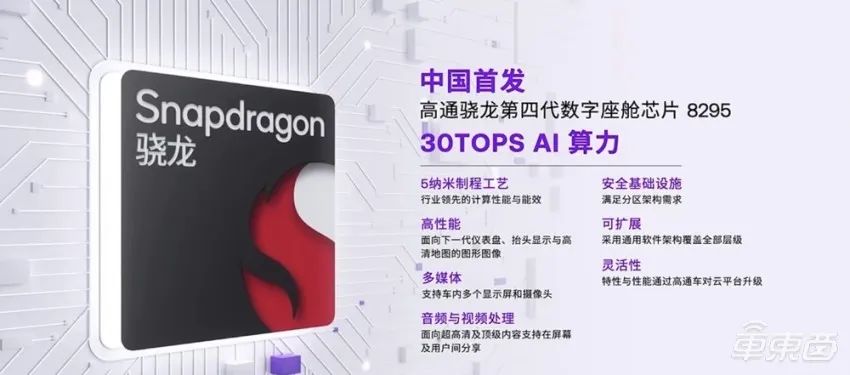 此前,在高通已经量产的第三代骁龙汽车数字座舱平台中,量产装车车型最多的是旗舰级芯片SA8155P(简称8155芯片),而8295芯片相比8155芯片在AI算力上提升了7.5倍。