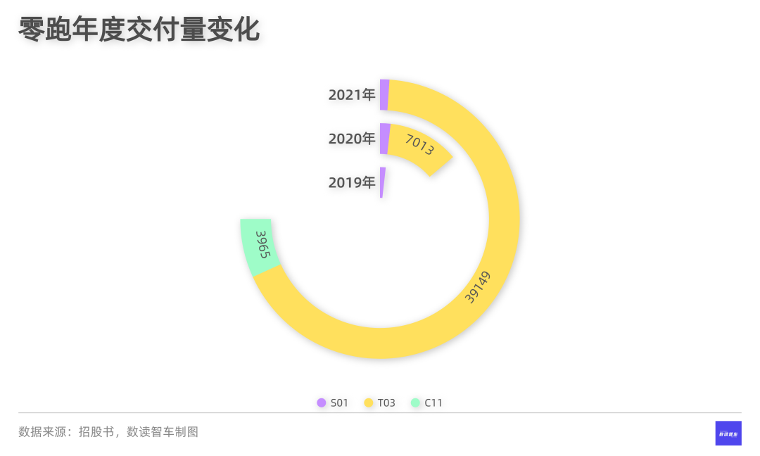 S01开门黑之后,零跑调整策略,做了小车T03。在外形上,酷似奔驰smart。由于售价较低,T03逐渐打开销路,到2021年一共卖了46162台,并且2021年Q4单季度销量超过了1.3万台,但说不错也只是跟S01比,这个时间段,造车新势力单月销量都可以超过1.3万。