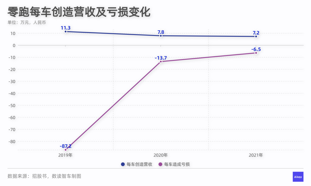 由于T03的价位低,并且目前依然占据销量的半壁江山,零跑最近三年的ASP(平均每台车销售价格)逐年走低。2021年的ASP只有7.2万。2021年,零跑全年亏损28.5亿,这已经是首次亏损低于营收,平均每台车亏损6.5万,造一台亏0.9台。