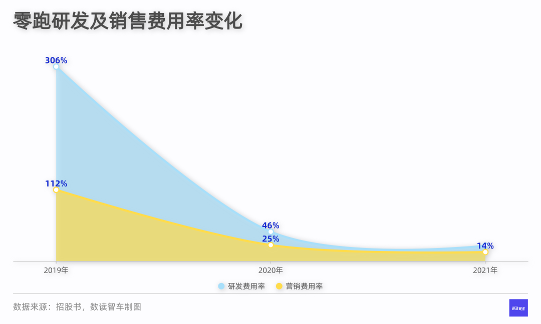 亏损的另一个原因也需要归结到零跑的模式上。全域自研的模式,看起来很好,但对资金的消耗也是巨大的。2021年研发费用7.4亿,研发费用率虽然有明显降低,但24%的费用率依然远高于已披露业绩的新势力。