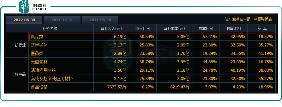 将业务拆分来看,公司营收主要来源于食品类板块业务,其占据公司总营收的半壁江山。2022年上半年,该业务收入6.19亿元,占比50.54%,同比+30.64%;其次是泛半导体领域,收入3.17亿元,占比25.89%,同比+62.26%;医药类收入2.89亿元,占比23.58%,同比+26.83%。