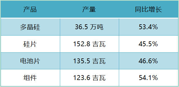 今年以来,光伏产业链主要环节保持强劲发展势头,多晶硅、硅片、电池、组件产量同比增长均在45%以上。