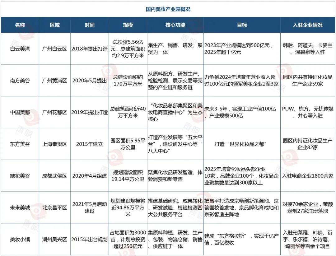 就配置而言,“白云美湾”“南方美谷”“东方美谷”“美妆小镇”“长沙美妆谷”等大部分美妆产业园已搭建起集研发、生产、检测、展示、营销于一体的完整产业链条,形成功能完善、配套齐全的美妆产业生态圈,为入驻的美妆企业提供就地配套支撑。