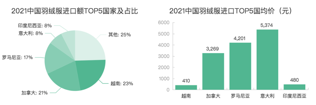 海关总署数据显示,2017年后中国羽绒服进口总额持续增长,2021年达53亿元,同比增长56%。其中,进口羽绒服总额TOP5国家分别为越南、加拿大、罗马尼亚、意大利和印度尼西亚,来自加拿大、罗马尼亚、意大利的羽绒服单件均价超3000元。