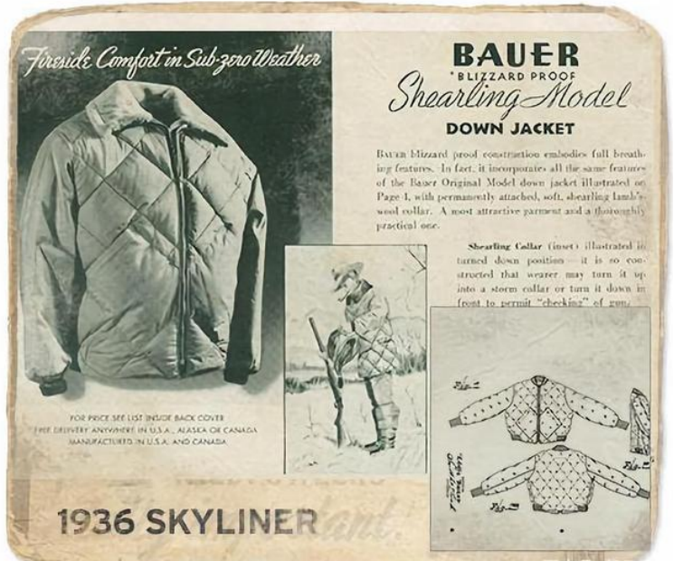 现代意义上的羽绒服诞生于1936年,由美国人埃迪·鲍尔(Eddie Bauer)发明。他创造性地将羽绒被所用的绗缝技法(把衣服缝成一个个“隔断”再填充绒)运用到服装面料上,解决了羽绒下滑与分布不均问题。1940年,鲍尔为自己发明的绗缝鹅绒外套Skyliner申请了专利。