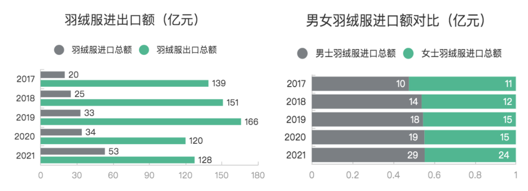 3 男装羽绒服市场消费需求正在打开。海关总署数据显示,2018年开始,中国羽绒服进口总额连续增长,2021年达53亿元。其中,男士羽绒服进口总额达29亿元,进口量342万件,均超女士羽绒服。