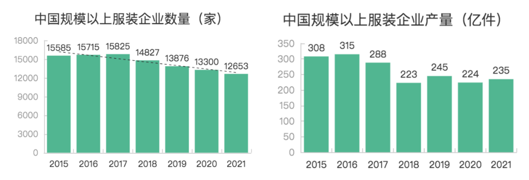 国家统计局数据显示,2021年规模以上服装企业数量减少至1.27万家,减少647家。规模以上服装企业产量从2016年的315亿件降到了2021年的235亿件。