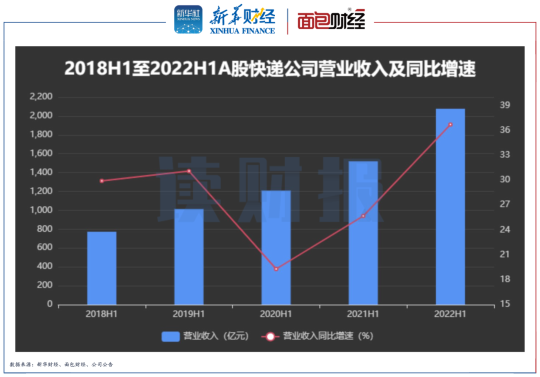 2022年上半年,A股上市的5家快递公司合计实现营业收入2077亿元,同比增长36.7%。