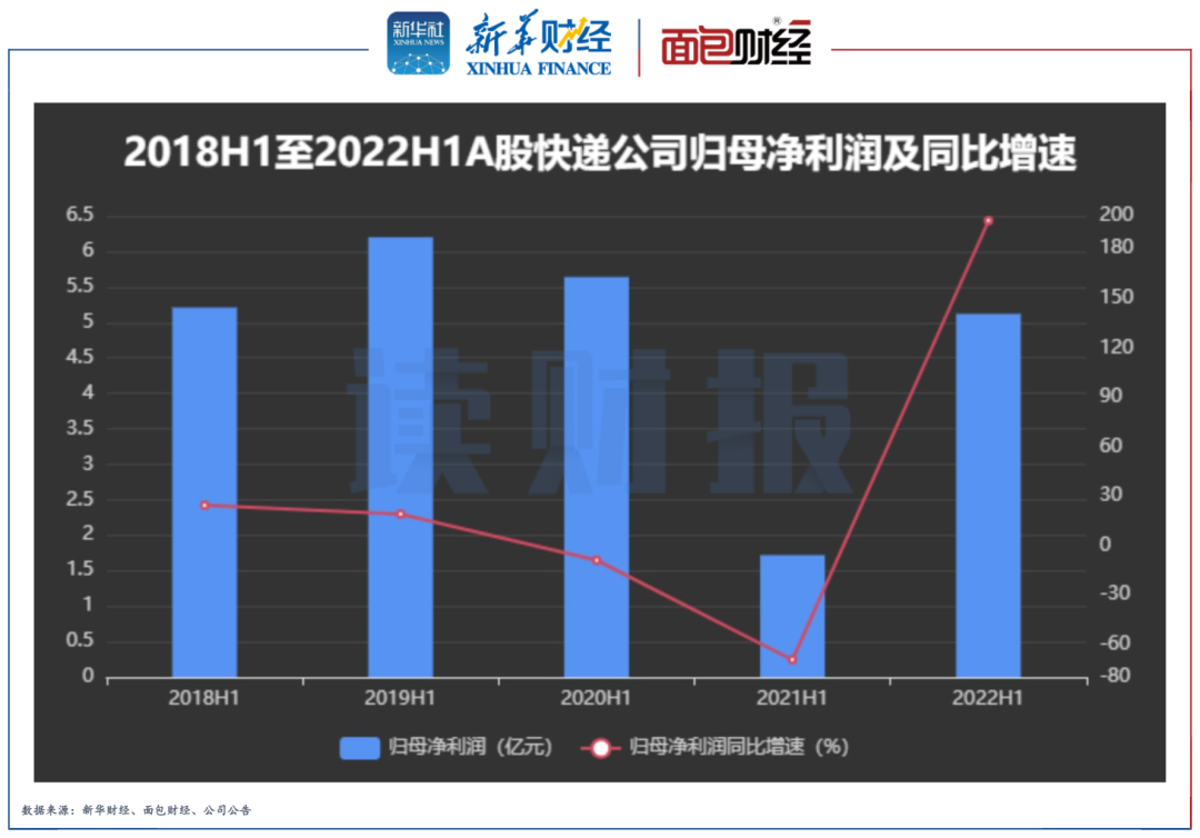 图3:2018H1至2022H1A股快递公司归母净利润及同比增速