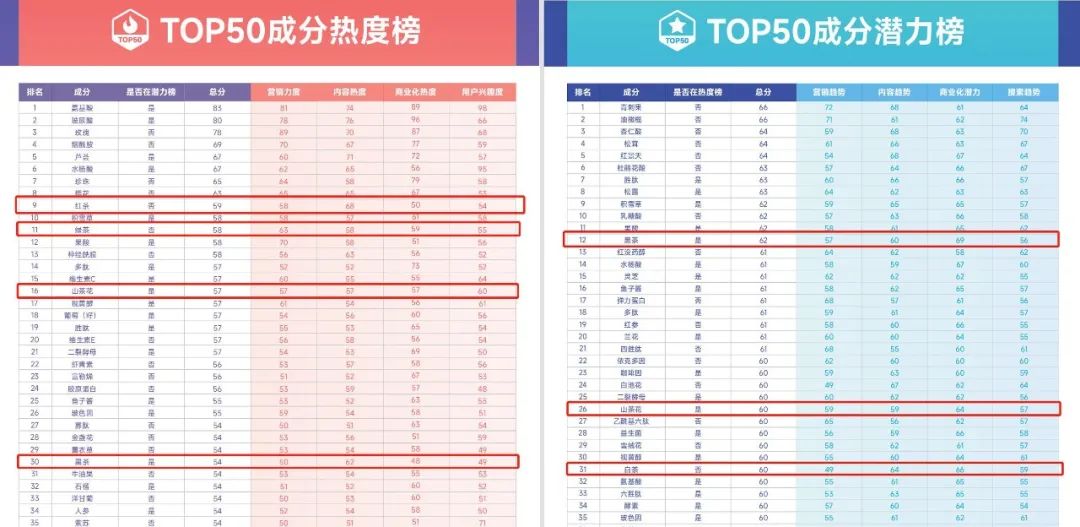 成分热度上,据巨量引擎颁布的《TOP50成分热度榜》,红茶、绿茶、山茶花、黑茶跻身TOP30;而在《TOP50成分潜力榜》中,黑茶、山茶花、白茶亦榜上有名,其中黑茶位居第12名,热度甚至超过红没药醇与二裂酵母。