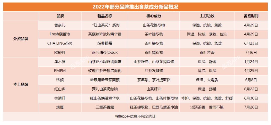 而在市场选择上,越来越多的化妆品品牌开始将“茶”作为宣称亮点。