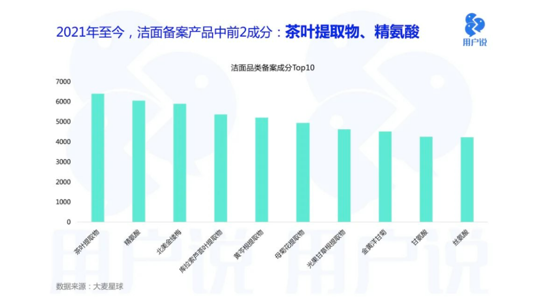 此话并非空穴来风。据用户说数据,2021年至今,洁面产品中前十的成分主旋律依旧是植物成分,其中,茶叶提取物拔得头筹。