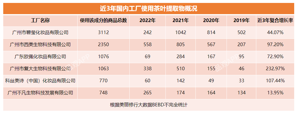 工厂端对该成分的青睐也急剧攀升。据美丽修行大数据,2019年—2022年,工厂使用茶叶提取物的产品数量大幅增长,如广州市复大生物科技有限公司,有超千款商品含有茶叶提取物,近三年复合增长率高达232.97%;科丝美诗近三年含茶叶提取物的产品数量复合增长率也超过三位数,达到107.44%。