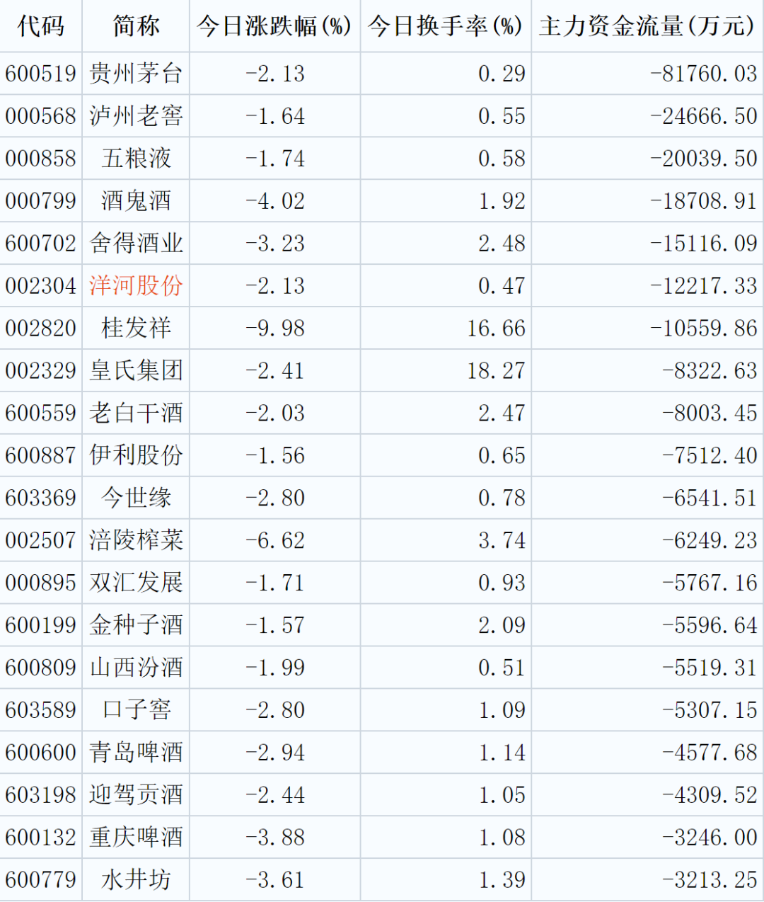 食品饮料行业资金流出榜