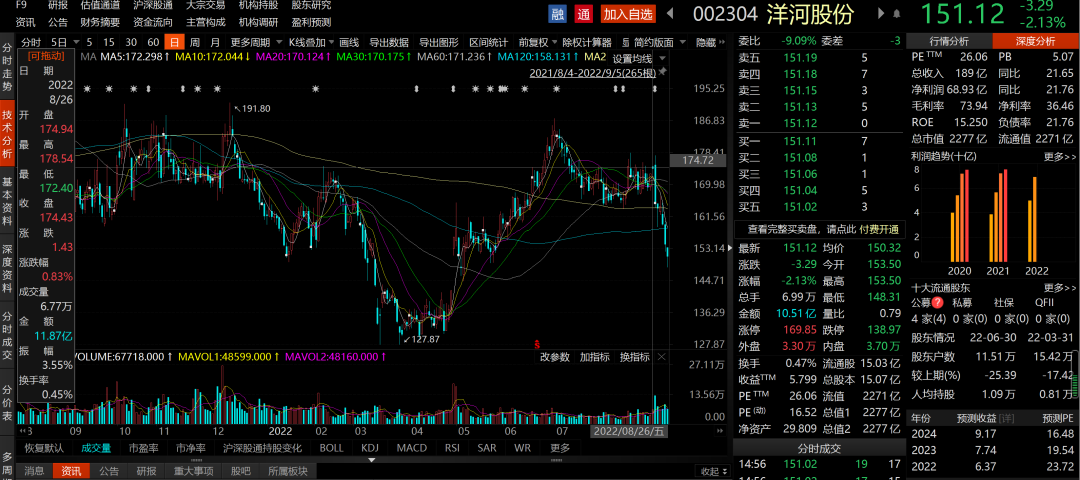 发公告的8月26日当天,洋酒股份开盘174.94元/股,盘中最高为178.54元/股,盘中最低为172.40元/股,收盘价为174.43元/股。看上去有点小失意,却也还好;接下来,就不那么好看了。