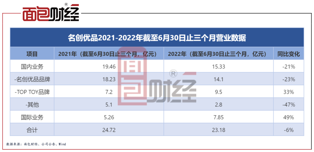 截至2022财年6月30日止三个月,公司国内业务同比下降21%至15.3亿元,其中名创优品品牌同比下降23%,其他业务同比下降47%,仅潮玩品牌TOP TOY品牌四季度营收同比上升。