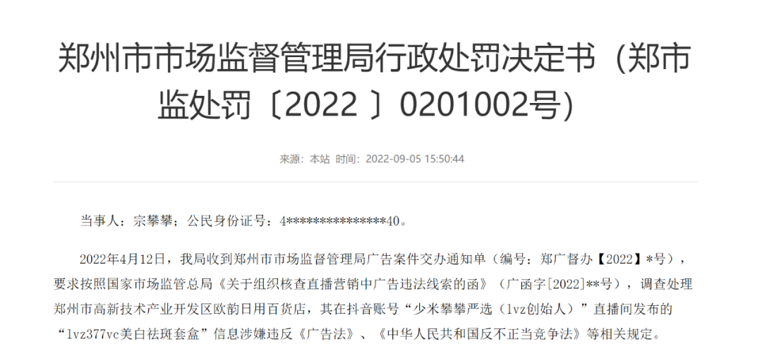 郑州市场监管局在决定书中指出,主播@少米攀攀严选(lvz创始人)没有证据证明该产品是“美白淡斑行业的扛把子(老大)、天花板(到顶)、美白淡斑的终点站”,涉嫌作虚假或者引人误解的商业宣传、欺骗误导消费者。