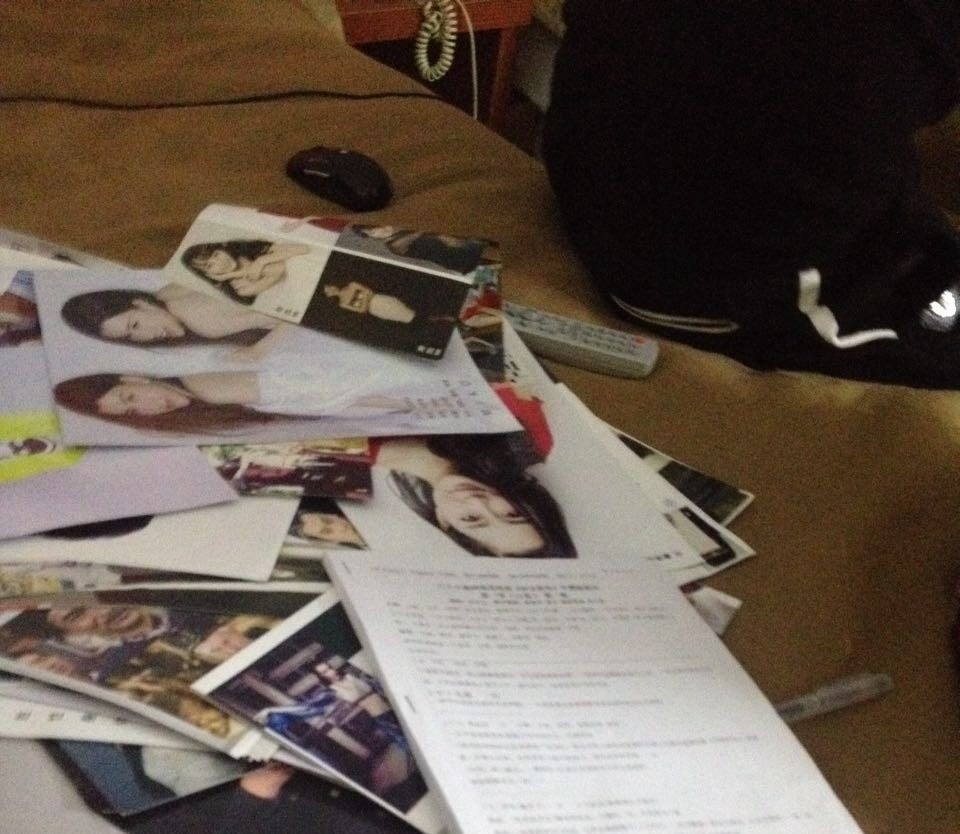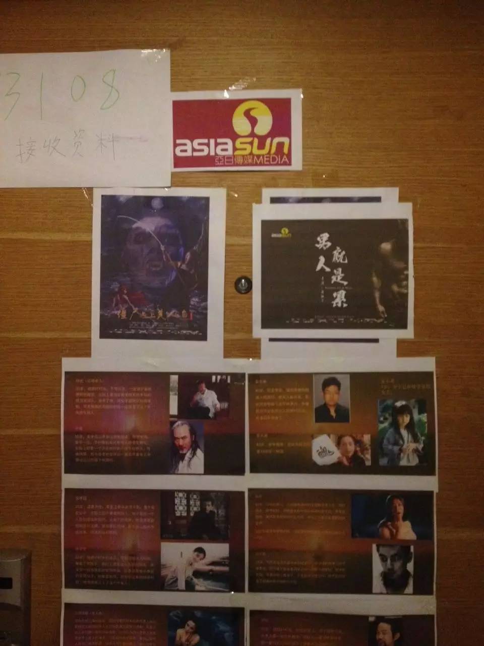 两张单人床上铺满演员资料,三分之二的墙壁被白板占据,不规则地贴着几张演员照片,图钉散布在白板角落,像待抛的锚。资料、照片、一次性杯子、白色笔记本电脑杂乱堆放在书桌上。矮个中年男人倚着桌子翻看资料,背后的灯光让人看不清他的表情。