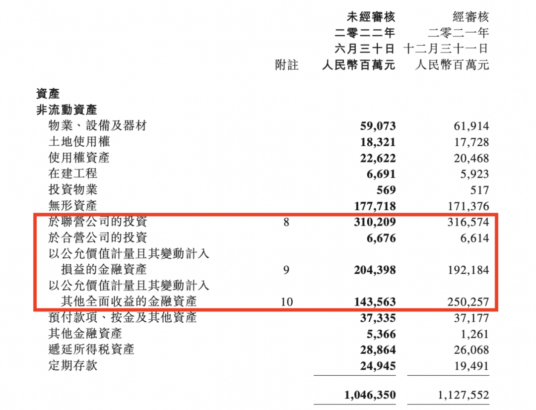 即使是在去年年底变相清仓式减持京东千亿市值股票之后,截至2022年6月30日,腾讯账上持有的联营和合营公司投资价然高达3168亿元,如果再以公允价值计量且变动计入当期损益的金融资产(非流动资产,主要是上市公司及非上市公司的股权)也算进在内,该金额则高达6600亿元,占其全部资产的比重达到45%,用“半壁江山”来形容其对腾讯的重要也并不为过。