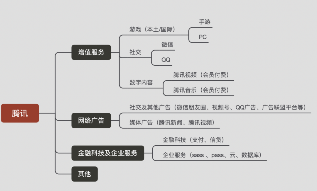 其中增值服务主要包括游戏业务、社交及网络;网络广告主要包括社交及其他广告业务、媒体广告业务;金融科技及企业服务主要包括支付及信贷业务、saas业务、云服务业务、数据库业务。具体细分如下图: