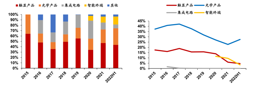联创电子,华为、vivo的光学供应商之一,在手机需求持续下降的情况下,客户削减订单、延迟提货、产能过剩现象频出,最新半年报中,光学产品的营收占比微乎其微,毛利润也从2017年的巅峰一路下滑……