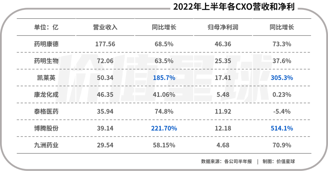 但在细分板块表现上,CXO(医药外包服务)板块已恢复之前的增长势头。截至8月30日,A股已有29家CXO上市公司发布半年报,21家净利润同比增长,占比超七成。其中不乏博腾股份和凯莱英这样,营收利润均成倍增长的企业。