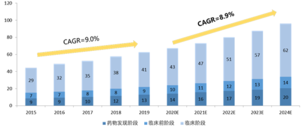 全球销量前列的药品专利大都集中在近十几年内到期,所以各大跨国药企争相加大研发投入,全球前14名的药企每年研发费用都超过50亿美元,还在稳步上升。竞争愈发激烈,新药盈利期更短,投入产出比不断降低,因而抢时间抢效率成为新药研发的致胜关键。于是把相对不太关键的产业环节,转移到成本更低的中国,成为了各大跨国药企的共同选择。