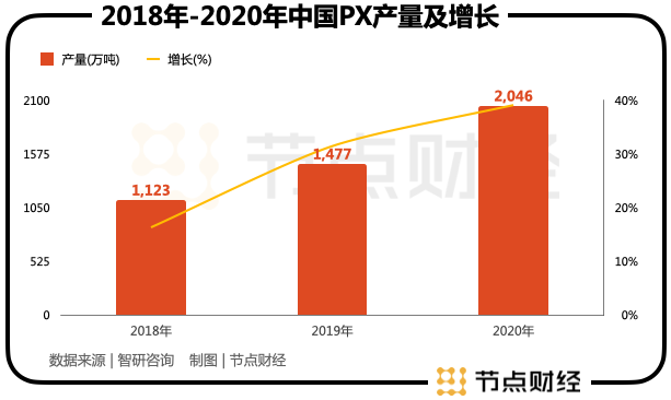 虽然仍然需要大量进口PX,但依存度在降低,而国内PX产能的释放在加快。2018年-2020年,国内PX产量分别为1123万吨、1477万吨和2046万吨,增速分别约为16.34%、31.49%和39.15%。