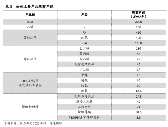目前,在上游方面,恒力石化拥有2000万吨炼化一体化项目,配套450万吨PX产能;中游,现阶段拥有PTA产能1160万吨,为全球单体最大的PTA工厂;下游,恒力石化的产品种类比较丰富,比如涤纶民用长丝、工业长丝、聚酯切片、工程塑料、聚酯薄膜、PBAT等等。