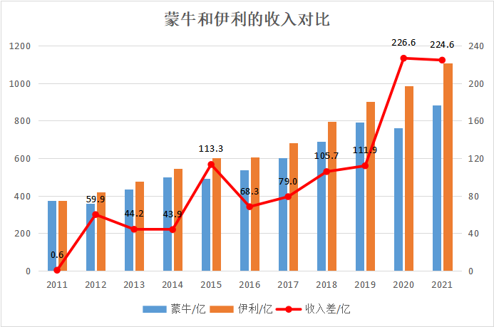 2011年到2021年这十一年间,蒙牛和伊利的收入差距从0.6亿变成了225亿,且收入差有进一步扩大的趋势。