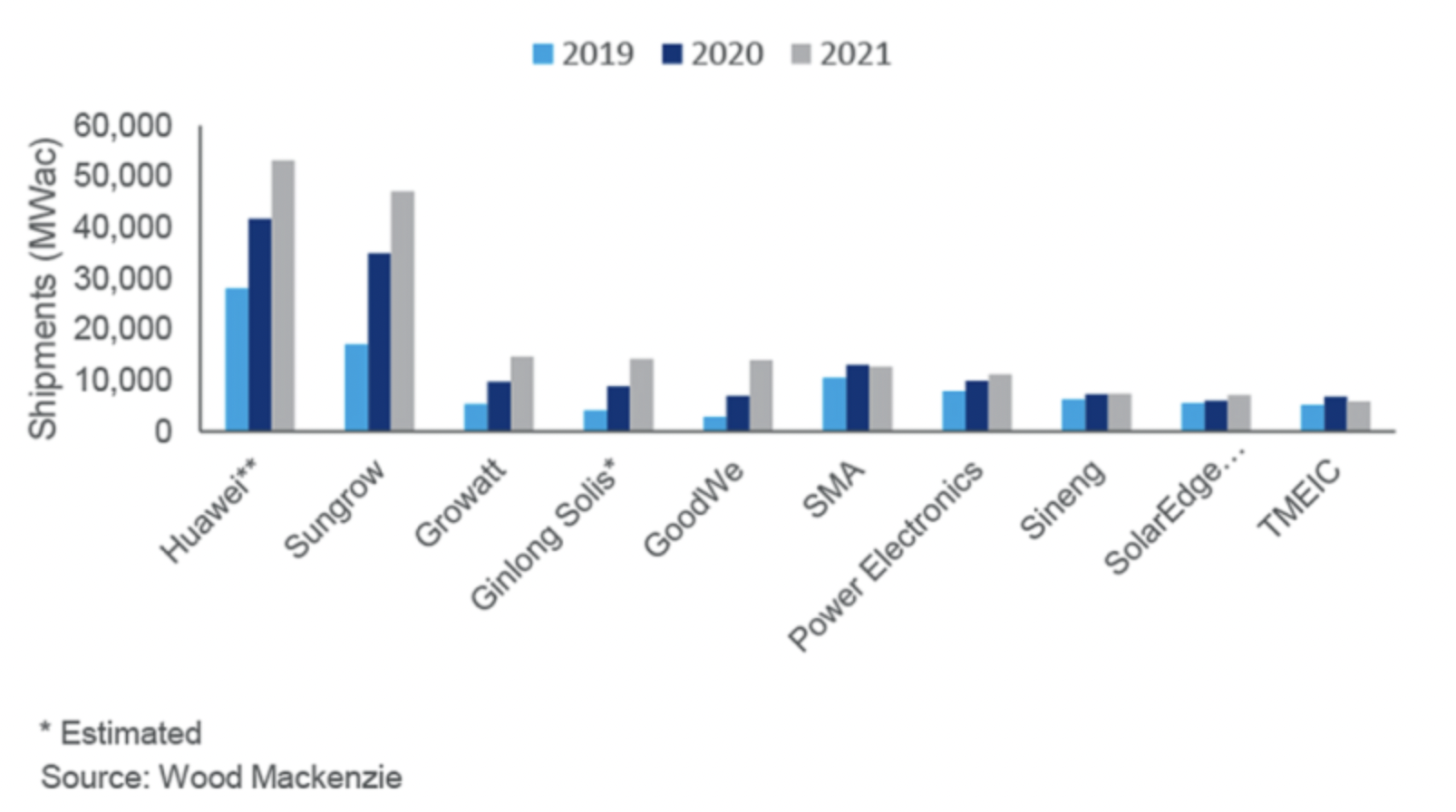 Wood Mackenzie表示,2021年全球前十名光伏逆变器供应商占据了82%的市场份额,同比增加2个百分点。