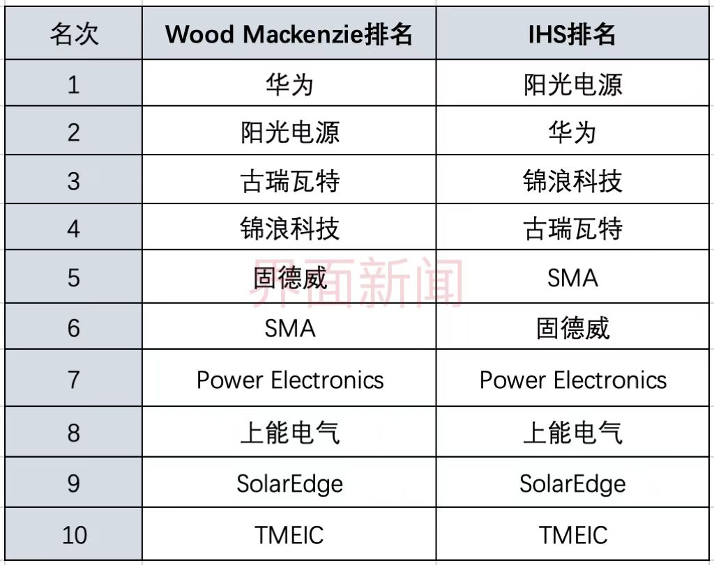 两份榜单最大的差异点在于第一名的归属。在IHS Markit的排名中,阳光电源(300274.SZ)超越华为升至榜首;在Wood Mackenzie排名中,华为则继续守住第一的位置。