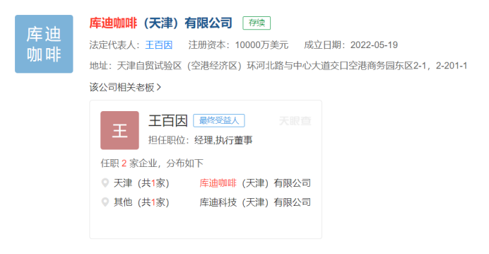 Tech星球报道:陆正耀正在筹备新的咖啡品牌,叫Cotti Coffee(库迪咖啡)。天眼查信息显示,Cotti Coffee背后的主体公司是库迪咖啡(天津)有限公司,成立于2022年5月,注册资本1亿美元,经营范围包括餐饮服务、食品销售、食品互联网销售。