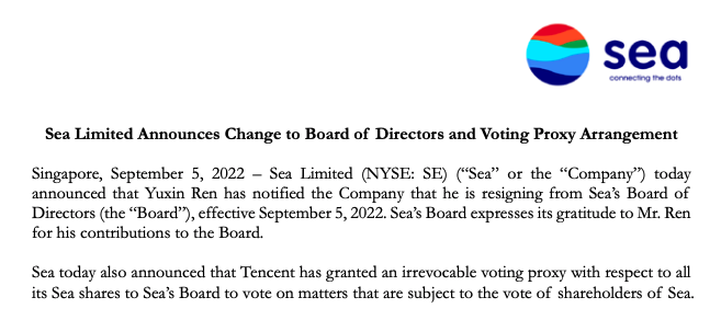 9月6日,新加坡冬海集团(Sea Limited)官网宣布,腾讯首席运营官任宇昕已通知本公司,他将辞去本公司董事会职务,于2022年9月5日生效。冬海集团还表示,腾讯已就其所持Sea股份向本公司董事会授予不可撤销的投票代理权。