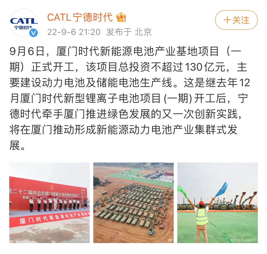 宁德时代9月6日于官方微博表示,9月6日,厦门时代新能源电池产业基地项目(一期)正式开工,该项目总投资不超过130亿元,主要建设动力电池及储能电池生产线。这是继去年12月厦门时代新型锂离子电池项目(一期)开工后,宁德时代牵手厦门推进绿色发展的又一次创新实践,将在厦门推动形成新能源动力电池产业集群式发展。