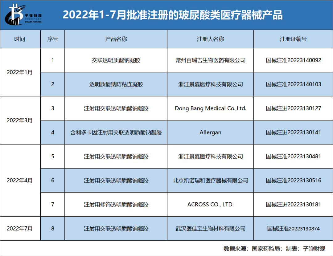 而「子弹财观」查询了国家药监局批准注册文件,发现今年仅1-7月就有8款玻尿酸注射剂产品获批,平均每月超过一款。