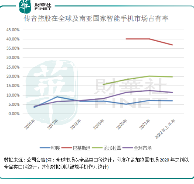 根据财华社统计,2022年上半年,传音控股无论是在全球手机市场,还是在印度、巴基斯坦和孟加拉国的智能手机市场,均出现了市场份额下降的趋势。其中,公司在巴基斯坦智能手机市场的份额下滑最严重,由2021年超过40%的市占率降至2022年上半年的36.8%。