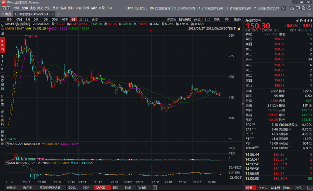 2021年5月27日,东鹏饮料在上交所完成IPO,上市便连续十几个涨停,股价在震荡中创下280.43元的最高点,折合市值1122亿元。