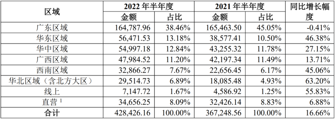 2022年上半年,广东区域这个基本盘变得不再稳固,当期为东鹏带来16.5亿元收入,属于负增长,拉低公司整体增速。要知道,同期华东、华中、广西、西南、华北五大区域的增速中位数为45.1%。