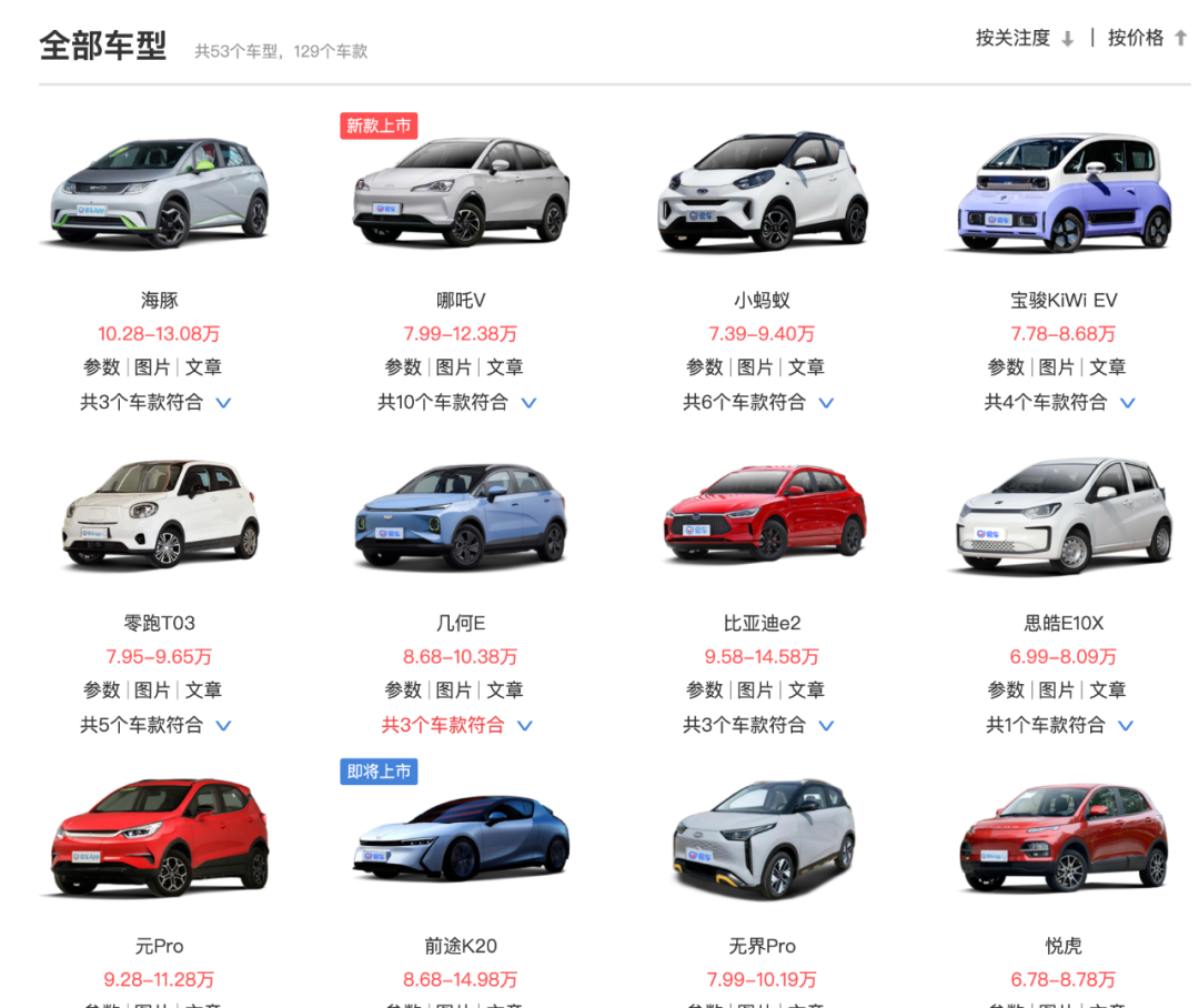在第一梯扎堆B级以上市场的时候,A0级、A级市场相对蓝海。在易车平台,搜索25-40万价格区间,燃油车有119款车型,电动汽车车型有71款,电动汽车占比37.4%;而在8-12万区间,燃油车约有240款车型,电动汽车仅有53款,电动汽车占比仅为18.1%。