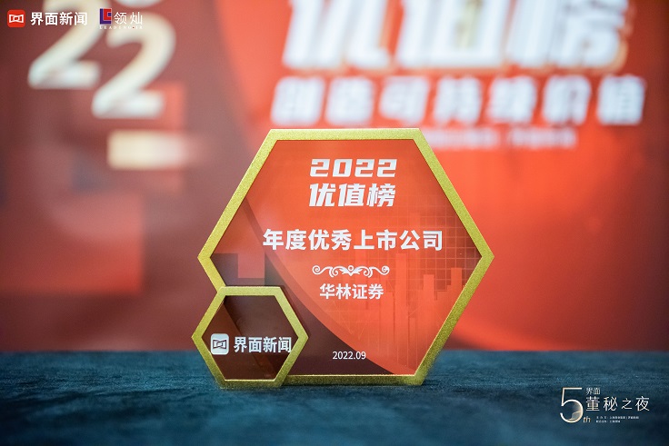 9月8日,由上海报业集团|界面新闻发起的2022【优值榜】颁奖盛典在昆明中维翠湖宾馆圆满落幕。百余家上市公司高管、资本行业专家们共聚一堂,现场见证上市公司年度荣耀揭晓。华林证券凭借在市场表现、创新发展、治理能力和ESG信息披露方面的亮眼表现,荣获年度优秀上市公司大奖。