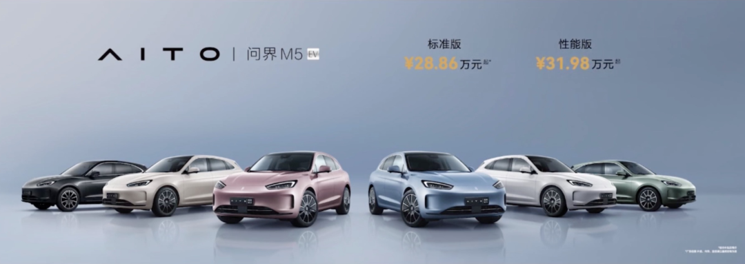 问界M5 EV共两种版本,售价为28.86万-31.98万元,CLTC续航最高达620km。