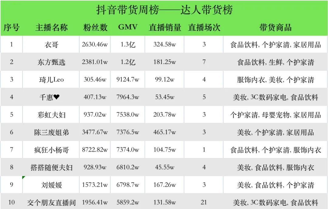 就好比,近期一位名为“衣哥”的带货主播在抖音势头正猛。飞瓜数据显示,衣哥凭借一周1.3亿的GMV成绩,超过彩虹夫妇、东方甄选、琦儿,成为近期抖音带货周榜榜首,颇有”黑马之势“。