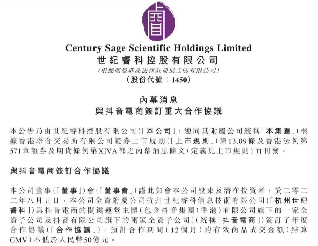 8月29日晚,世纪睿科控股有限公司宣布,与交个朋友签订了为期五年的独家合作协议。协议规定,杭州世纪睿科将通过运营交个朋友旗下的抖音账号,向客户提供直播技术支持、现场运营、视频内容制作、产品销售等新媒体服务。在这之前的8月5日,世纪睿科已经宣布子公司与抖音电商签订50亿“年框”。