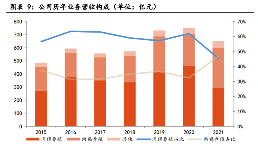 近几年公司各业务中,肉猪养殖业务收入约占总收入 60%,肉鸡养殖业务收入约占总收入 35%,其他业务收入约占总收入 5%。2021 年公司销售肉鸡 11.01 亿羽,约占全国黄羽鸡和白羽鸡总出栏量的 11%,在同行业 A 股上市公司中排名第一。