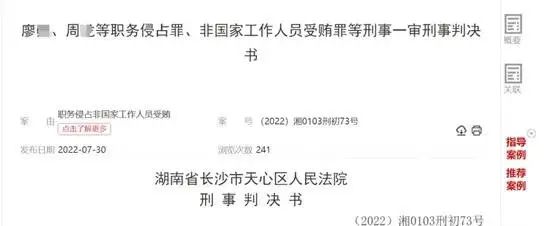 据中国裁判文书网披露的湖南省长沙市天心区人民法院一审刑事判决书显示,时任文和友食品公司法定代表人的廖某等三名文和友食品科技有限公司员工因犯职务侵占罪、非国家工作人员受贿罪被法院判刑,涉案金额超百万元。