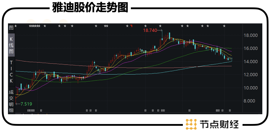 而在资本市场,强劲的业绩支撑力和赛道的景气度很早便反应到了股价上。从3月15日低点7.31港元算起,到7月15日高点18.74港元,雅迪控股期间最大涨幅超过156%,总市值一度超过500亿港元。